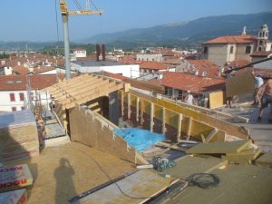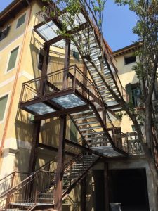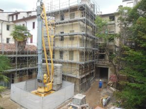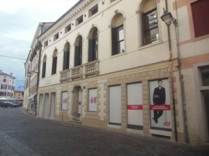 Gli interventi realizzati si sono resi necessari per poter trasformare un palazzo in centro storico a Bassano destinato ad uso abitativo, in negozio utilizzato dal marchio H&M. In particolare si è lavorato per: – rimuovere tutte le pavimentazioni non vincolate per permettere il rinforzo dei solai lignei con inserimento tra i travi di profili metallici o la realizzazione di piolature con cappe collaboranti. – aprire anche su murature portanti dei grandi varchi per i collegamenti tra i vani con rinforzi strutturali puntuali tramite la realizzazione di portali in profili metallici o misti acciaio calcestruzzo – realizzare un vano ascensore interno a 4 fermate e una scala aggiuntiva di collegamento tra il piano secondo ed il sottotetto in calcestruzzo armato – la modifica della copertura principale con la realizzazione di un volume di ampliamento in struttura leggera necessario per l’alloggio delle macchine di trattamento dell’aria – la fornitura e posa di una scala antincendio in ferro zincato e colorato e delle relative opere di fondazione – la trasformazione del vecchio corpo delle scuderie in area destinato agli uffici ed al magazzino , con consegna degli ambienti “chiavi in mano” – il ripasso di tutte le coperture con nuova impermeabilizzazione e nuovo manto in coppi – le sistemazioni esterne del giardino comprese le nuove linee dei sottoservizi e le predisposizioni delle platee come nuova sede per gli impianti di riscaldamento ed antincendio – il restauro delle facciate e la loro ritinteggiature – il restauro dei serramenti esterni, dei balconi e la fornitura di quelli nuovi sia interni che esterni – la realizzazione delle finiture delle nuove scale di collegamento ai pieni in pietra serena, dei necessari parapetti in vetro , dei corrimani in acciaio inox e dei cosciali di rifinitura in acciaio verniciato.