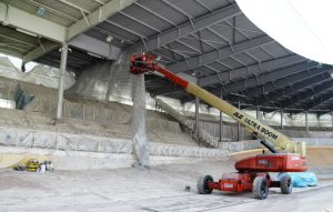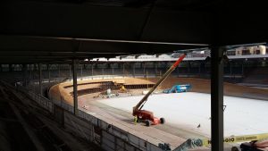 Il primo lotto di lavori, affidati alla ditta Faggion Antonio srl, ha riguardato la manutenzione ordinaria e straordinaria della pista in legno e della copertura in acciaio. Viste le ridotte tempistiche a disposizione per l’esecuzione dei lavori, circa 4 mesi, il cantiere è stato suddiviso in settori, al fine di poter operare in simultanea sia con le attività eseguite in copertura sia con quelle eseguite sulla pista in legno.