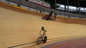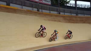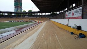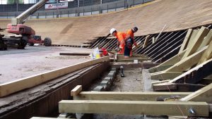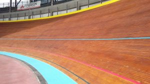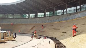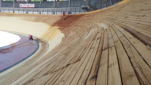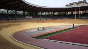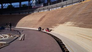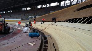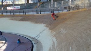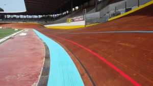 Per quanto riguarda invece la pista in legno, la prima fase è stata quella di eseguire una pulizia della superficie del piano di scorrimento della pista, mediante levigatura per quanto riguarda i rettilinei e mediante sabbiatura per quanto riguarda le curve, che presentano un’inclinazione di circa 45°, quindi con notevoli difficoltà di operare da parte delle maestranze. Un volta ripulita la superficie dallo sporco e dalla patina depositata negli anni, è stato possibile verificare lo stato di conservazione del piano di scorrimento della pista, realizzato in listelli di legno di abete di dimensioni circa 5 x 5 cm, inchiodati alle sottostanti capriate lignee. Si è quindi proceduto con la demolizione delle zone di pista ritenute non più recuperabili, perché marcite o degradate dopo circa 20 anni di mancata manutenzione e abbandono. Una volta messa a nudo la struttura, si è passati alla verifica di tutti gli elementi strutturali che compongono le capriate di sostegno, andando a sostituire, integrare e rafforzare gli elementi degradati. Si è passati alla richiusura del piano della pista, mediante fornitura e posa di nuovi listelli di abete, proveniente dalla Val di Fiemme in Trentino Alto Adige, ovvero della stessa natura e provenienza di quelli che costituivano la pista originaria precedente. Infine si è passati alle lavorazioni di lamatura, trattamento superficiale del piano e ri-tracciatura della segnaletica secondo quanto stabilito dal regolamento del CONI e delle federazioni ciclistiche intervenute per l’omologazione finale dell’impianto. Durante le fasi di manutenzione della pista sono stati eseguiti alcuni test e collaudi da parte di corridori professionisti del passato e del presente, esperti delle gare ciclistiche su pista, al fine di poter ottimizzare e perfezionare eventuali anomalie riscontrate.